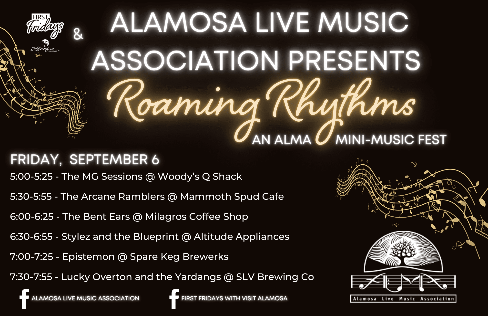 Get ready for an unforgettable evening of live music as the Alamosa Live Music Association (ALMA), in collaboration with Visit Alamosa and First Fridays, presents Roaming Rhythms: an ALMA Mini-Music Festival on Friday, September 6th, 2024. This free, multi-venue mini-music festival will take over downtown Alamosa for First Fridays, turning it into a vibrant celebration of local and regional talent.