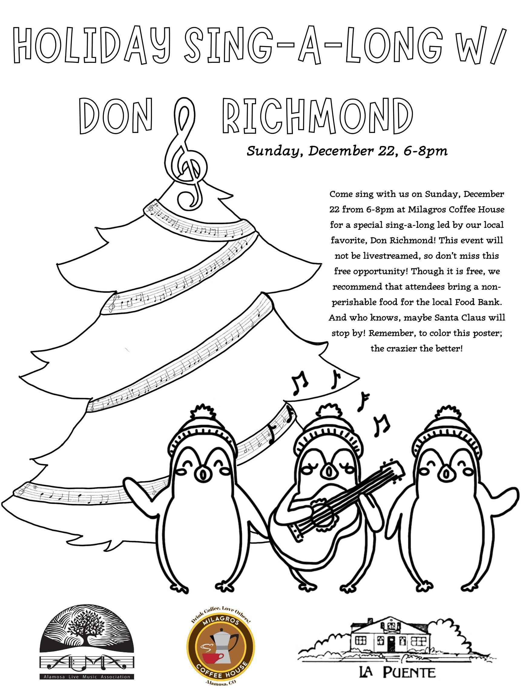 Come sing with us! The Alamosa Live Music Association and La Puente invite the community to sing along to holiday tunes, new and traditional, on Sunday, December 22 from 6-8pm at Milagros Coffee House in Alamosa. The Sing-Along will be led by our local favorite, Don Richmond.
