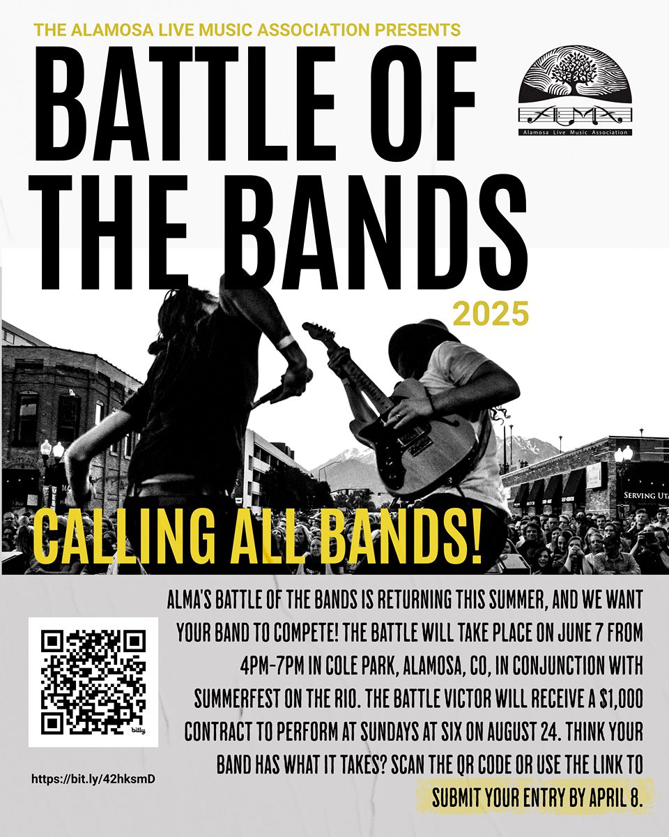 ALMA’s Battle of the Bands is back for 2025! The Battle will happen on June 7, 2025, from 4pm-7pm, in Cole Park, Alamosa, CO, in conjunction with Summerfest on the Rio. The victor gets a $1,000 contract to perform at Sundays at Six in Cole Park on August 24, 2025! Five bands will compete and each band will have approximately twenty minutes to WOW the audience and judges. To submit your band for consideration to be in the battle, fill out the submission form here by April 8, 2025.